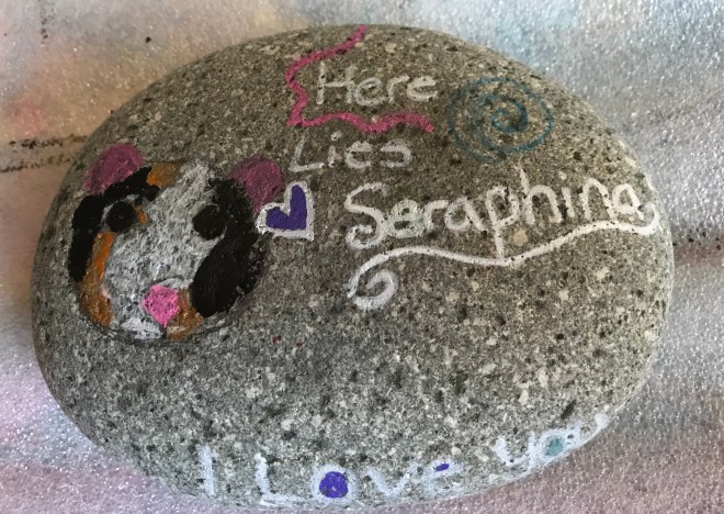 We had a ceremony on Sunday January 6. We buried her in the woods, in a box, wrapped in tissue paper and covered in rocks. Our dearest daughter made the beautiful headstone you see in the photo. We all shed a tear, she may have just been a guinea pig but she had found a way into all of our hearts and she was a real cutie, full of personality.
