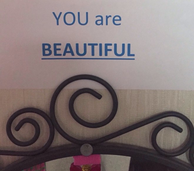 How do we do this? Well this is where we as women must lift each other up too. I challenge you to give everyone you meet tomorrow a compliment. I challenge you to find things that will inspire your daughters to be the most beautiful people they can be by bringing others up. Lead by example. Don’t gossip, don’t bitch and moan, always talk positively about your friends and their strengths and always remind your daughters to be the best “insert name here” they can be. I also went into my daughter’s room whilst she was at school today and put inspirational quotes, and reassurances everywhere. Including some I thought pertinent to just her at this time. And there are quite a few for when she’s laying in bed looking at her ceiling: