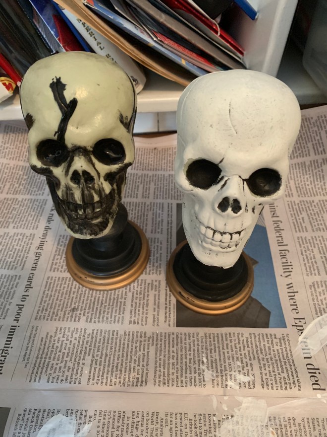 Super easy too! All you do is give the skull a light sanding and using acrylic paint, darken the already darkened areas on the skull. Grab a light grey paint (or gold/brown or whatever colour you like) then go over everything else, leaving the darkened spots in place to contrast. The great thing is that if you make a mistake, you can easily go back over it with whatever paint you need to!