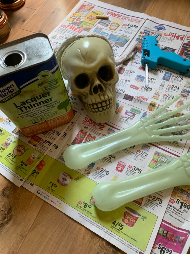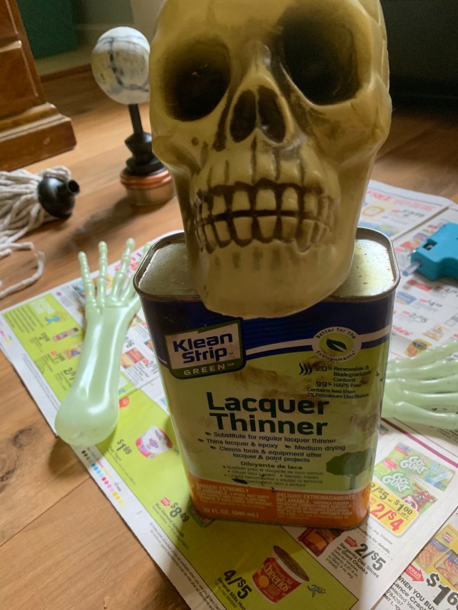 I bought 2 stake (as in you normally stake them in to the ground) glow-in-the-dark arms from Dollar Tree as well as one of their skulls. I bought a mop also from there. I had an empty lacquer thinner container that I used as my ‘body’ (after I had rinsed it, of course) and got one of my son’s old shirts.