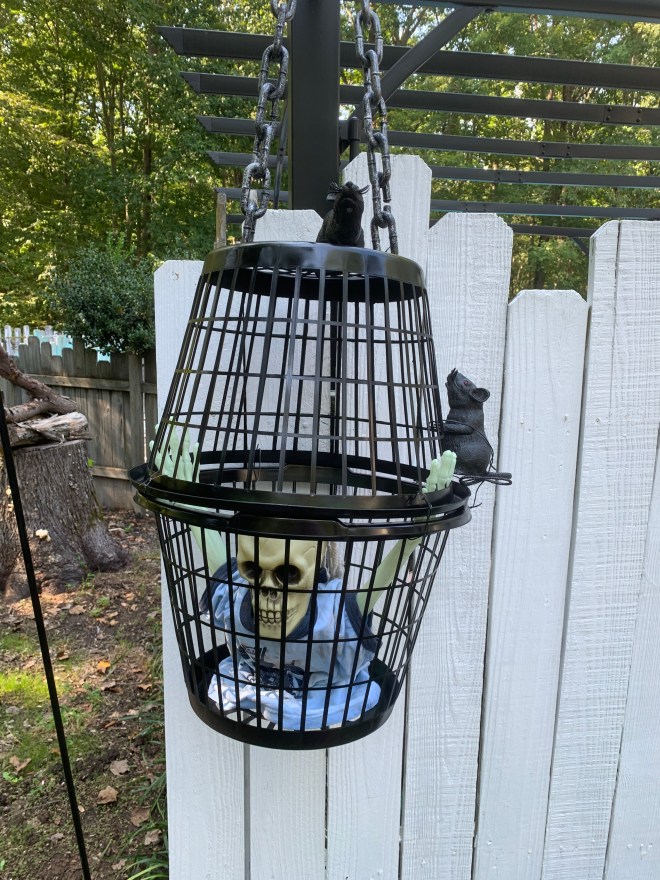 After the baskets were dry (having sprayed both inside and outside of each) I placed my ‘half-guy’ into the basket and put the other one on top. I placed the hands where a I wanted them to go and zip tied everything in place. Then it was a matter of putting a couple of Dollar Tree rats on the outside of the cage and a chain from there also and zip tying those into place too. It has been outside in all sorts of weather and still looks great!