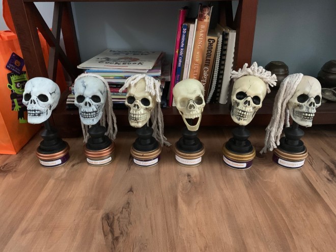 Then I got a candle (also from Dollar Tree) that fitted into the top of the trophy perfectly. I hot glued this in place (just the lids so that if someone wants to use the candle they still can). Some of the candles I painted in a metallic acrylic paint, others I left as is. I printed out trophy names on the printer, cut them out and modpodged them to the candle cases. I glued hair on some and not on others, there’s even one as a gag trophy to a friend of ours because he promised to finally wear a costume to this year’s party! 😆