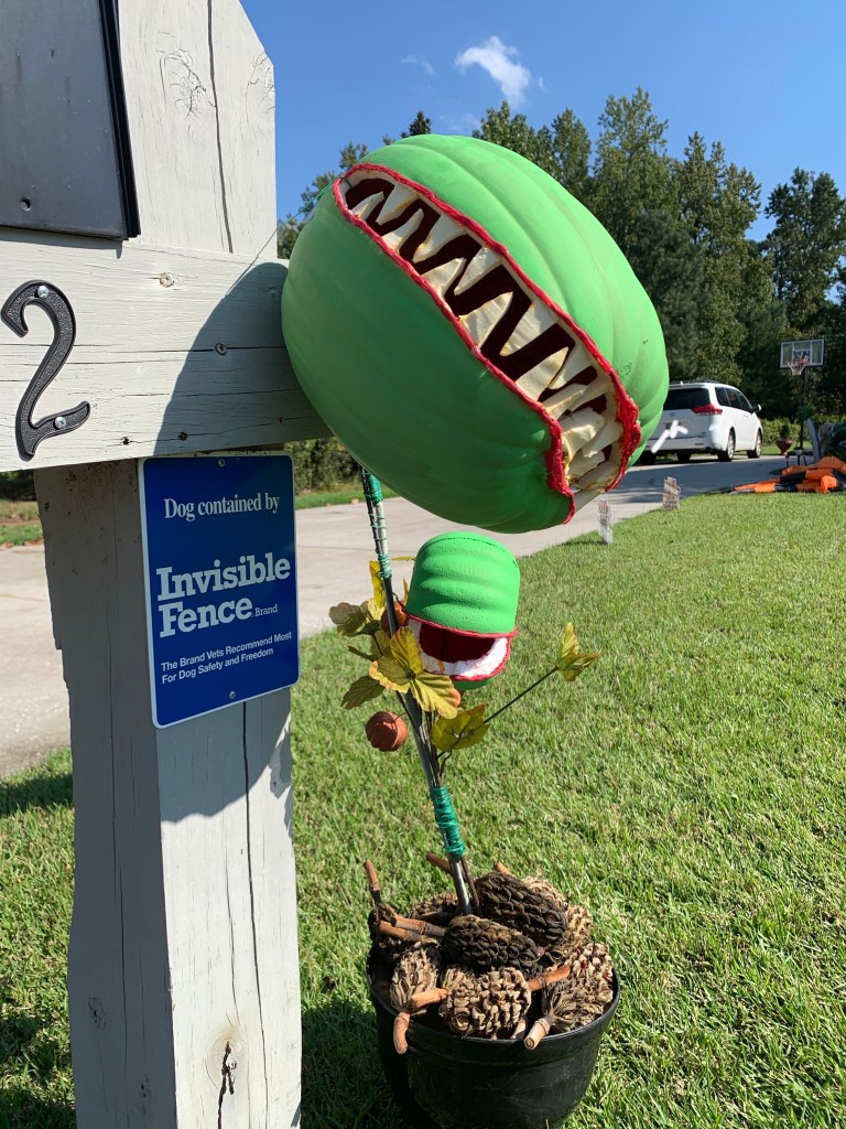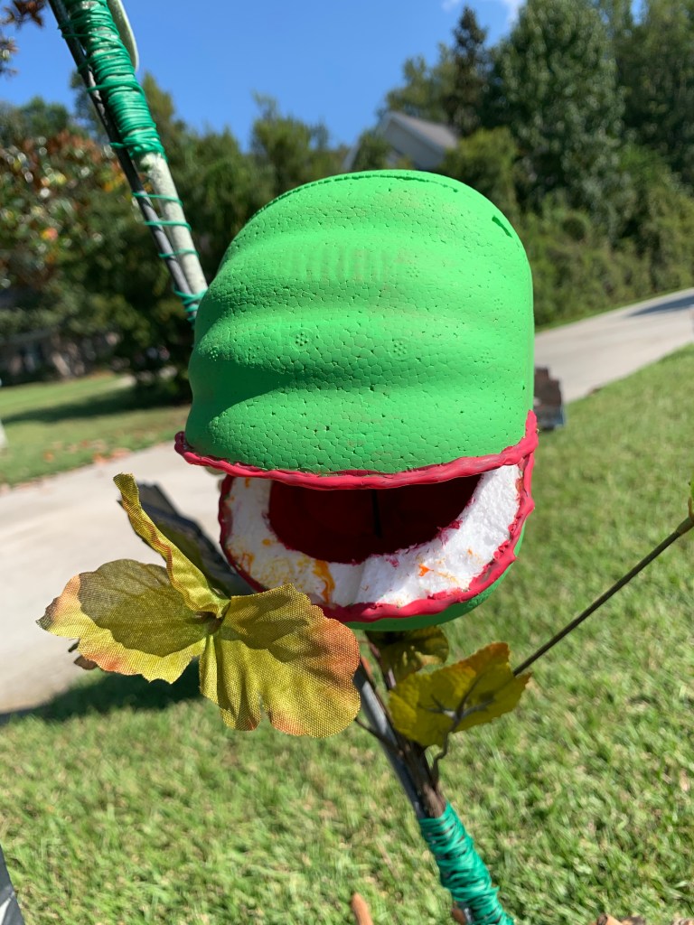 So, we happened to be in Michael’s a few weeks ago and I saw this really cute (but pricey) Venus fly trap. Rather than pay the $100 price tag for this cute Halloween prop, I thought I’d make it! Turned out fairly easy too and quite the neighborhood talking point and centerpiece.