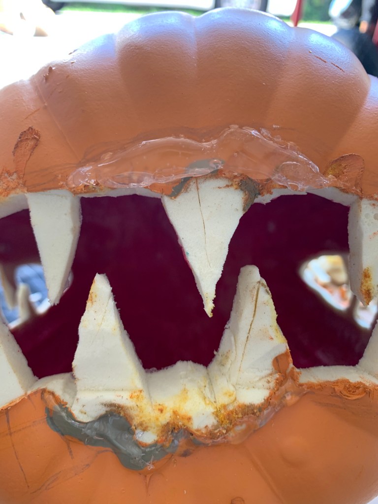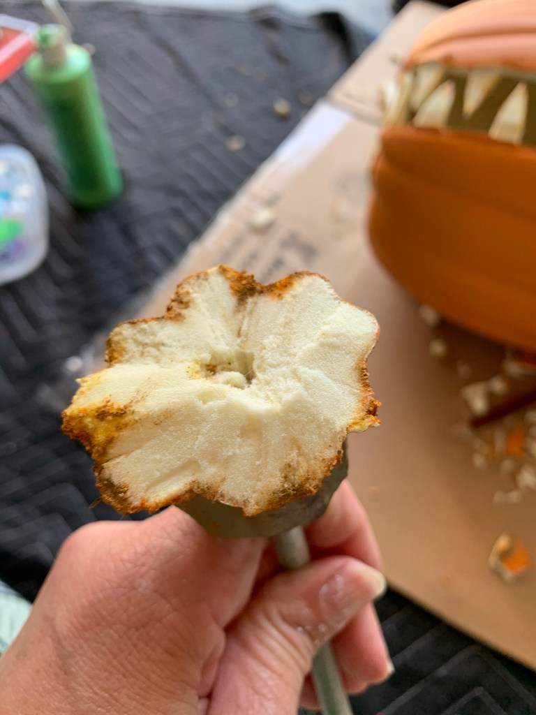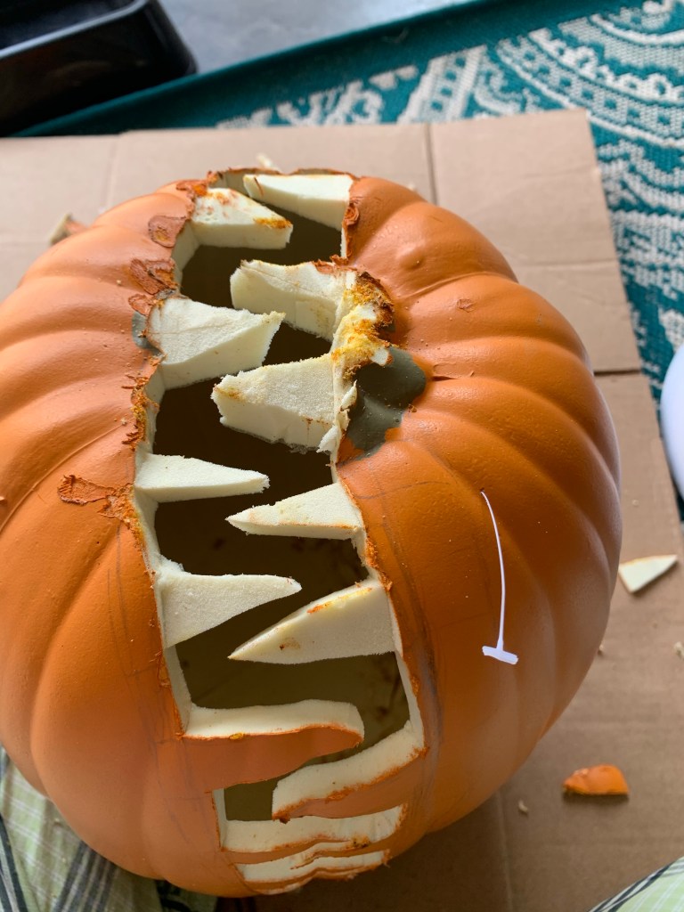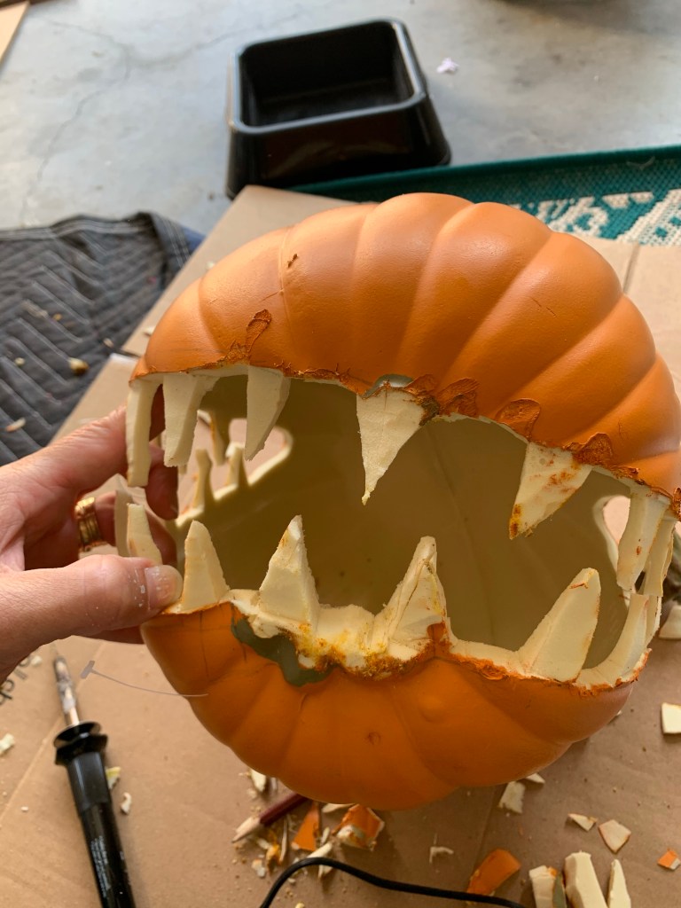 As you can see in that last photo, I used the hot knife in a sidewards motion to scrape/melt/cut the “pumpkin” skin off the side of the teeth and found their off-white look was absolutely perfect for the look I was going for. Be really careful doing this part though, it comes off easier than you think it will and I may have come dangerously close to cutting/burning myself!