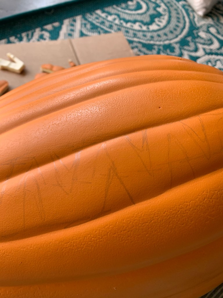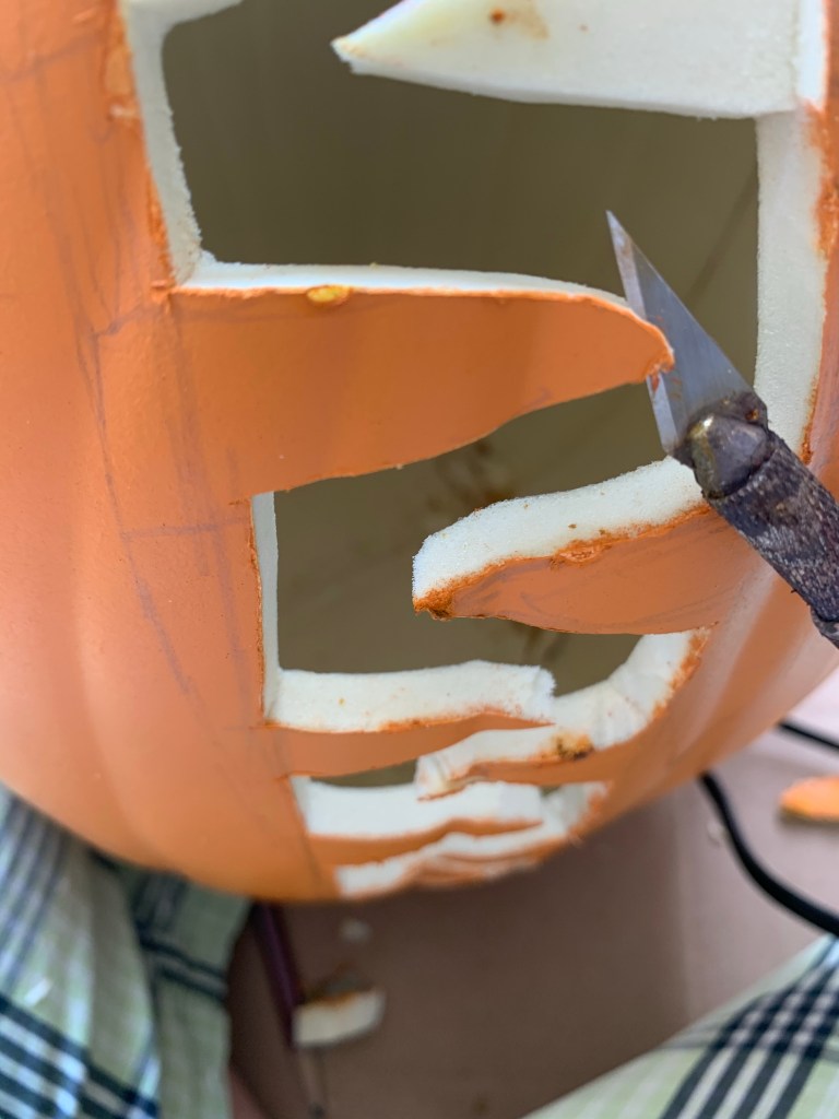 I did pick up a small pumpkin from the dollar store as well so I could have a practice run on carving one out as I had never used a hot knife and I had never carved a foam pumpkin before. It’s a really good idea to do a practice run as it does smell (a lot) so you definitely need to be outside or somewhere you can get some fresh air and using a hot knife is very different to using a box cutter.