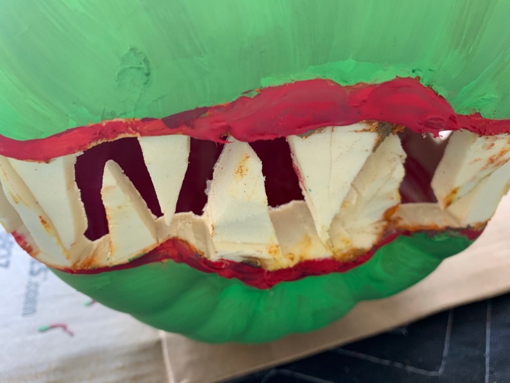 Then it was on to the painting. The first thing I did was pour red paint inside the “mouth” and use a long paint brush to delicately push it around the entire inside of the mouth. This took some patience as it was on very thickly (to be able to swirl it around inside without damaging any of the teeth on the outside) and took forever to dry! I used two different shades of green (just from Walmart’s cheap acrylic paint selections & painted until I was happy. Each side of the pumpkin took 2 coats followed by some touches up. The lips were painted after the green was dry and that’s where I had to do some touching up around the edges.