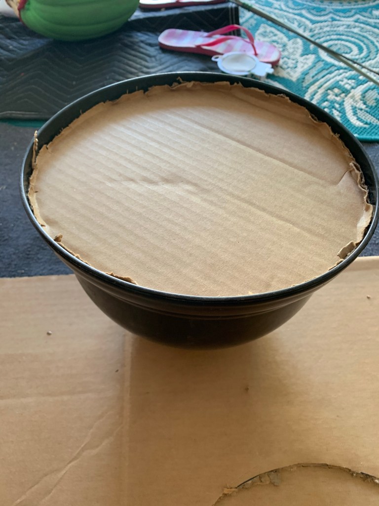 After I was happy with the painting side of it, I put a hole in the original stem for the sunflower stems to go through and glued it on to the other side of her, but as I said earlier, I found the glue wasn’t quite strong enough so I ended up finding a screw and screwing the stem down. Now it was a matter of getting her to be able to stand on her own and look like she was a little more polished. I used both sunflower stems but actually found these weren’t strong enough on their own so had to get some floral wire and wrap it around the stems, reinforcing them a little bit. I put the stems in a black pot I already owned and used a couple of bricks/stones to hold them in place. In the meantime I had traced a hole (using the pot as my frame) from a piece of cardboard (one of our thicker moving boxes) and used it to cover everything in the pot. I wanted this to sit in there nicely and securely so it was really a matter of cutting little tiny slits all around the edge of the original circle to make it squeeze inside the pot perfectly.