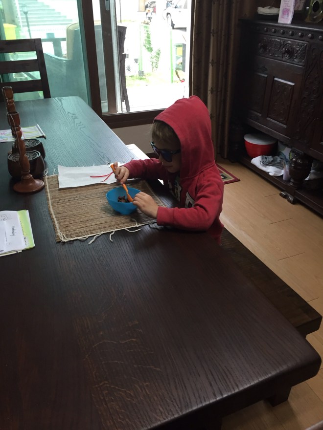 “They have to find a way to afford it, there is no other answer.” Was her reply. Wow! I asked about home schooling and this didn’t seem to be an option. So now I sit here and feel very lucky to have found not only this wonderful school where there are so few students, but to have even gotten Hunter into a school in the first place. This is something very few outsiders get to experience and we were welcomed today as part of the community. I had so many adults and children walk up to me and say “Hi!” Eun Mee said they wanted to talk so much more with me but couldn’t speak enough English to do so, my thoughts were I wish I could converse with them in Korean but I’m too old to learn another language fluently in the time we’ve got here! But Rebecca and I have a plan to at least do a basic Korean course. We will find out what we can next week about what is on offer through the military before looking privately. I shall at least be able to ‘get by’!